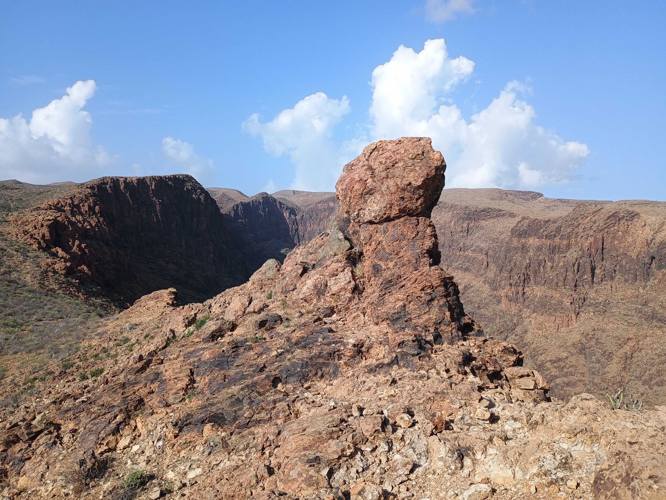 Después del Mojón de Fuego se puede continuar subiendo por una vereda, cerca del barranco de los Ahogados, pero en esta ocasión se sube al Alto Grande por el cresterio y se continua por él para acercarnos al Caidero del Barranco Hondo.